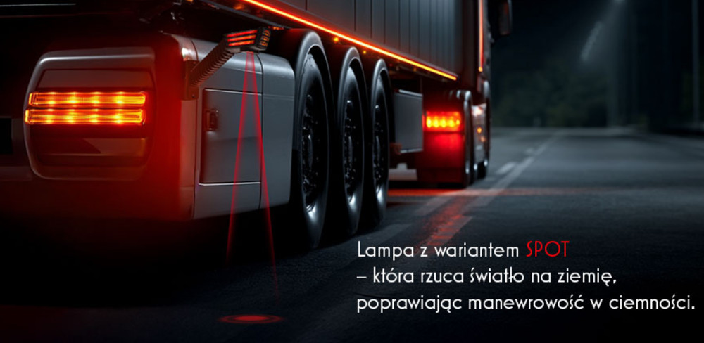 Lampa Waś 2552 SPOT to zaawansowane rozwiązanie oświetleniowe stworzone dla profesjonalistów transportu. Łączy w sobie funkcję klasycznej lampy obrysowej z nowoczesną technologią SPOT, która rzuca na podłoże skupioną wiązkę światła w kolorze czerwonym, wyznaczając precyzyjną linię obrysu pojazdu.