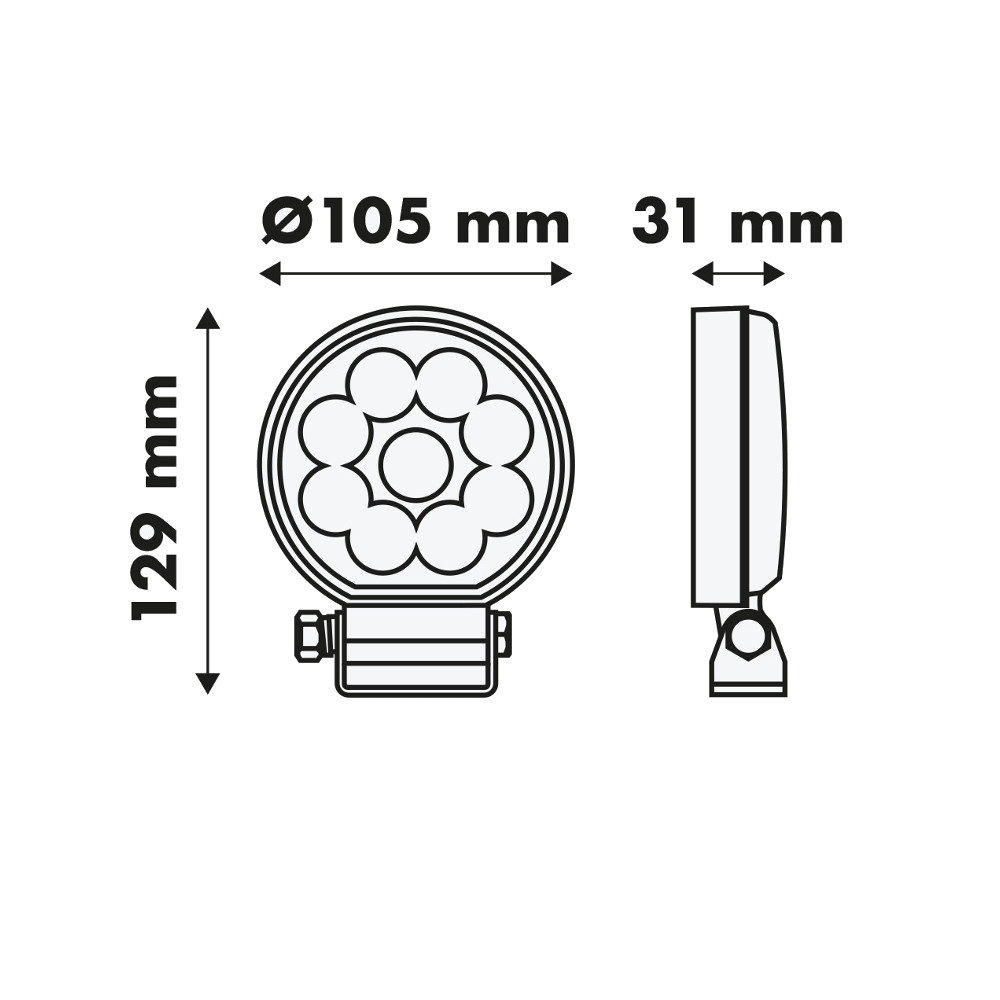 Okrągła lampa LED o średnicy 10,5 cm to uniwersalne rozwiązanie dla maszyn rolniczych, budowlanych i pojazdów specjalistycznych. Jej rozproszone światło sprawdza się doskonale jako główne oświetlenie robocze, oświetlając szerokie pole pracy. Kształt i rozmiar lampy czynią ją praktycznym zamiennikiem standardowych reflektorów, zapewniając niezawodność i komfort pracy nocnej.